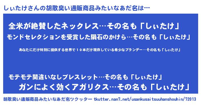| 意味不明あだ名 | 『住所不定無職しぃたけ(84歳)』 |