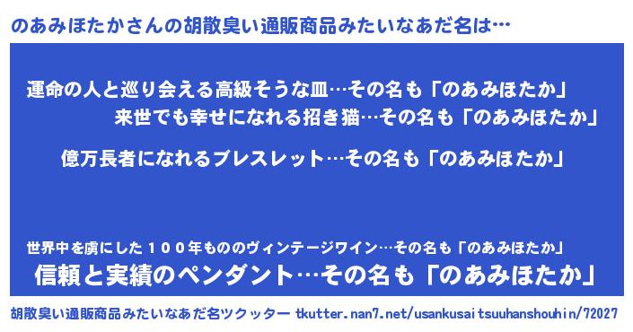 | 男性向けラノベタイトル風あだ名 | 『のあみほたか~年齢イコール彼女いない歴の魔法使い~』 |
