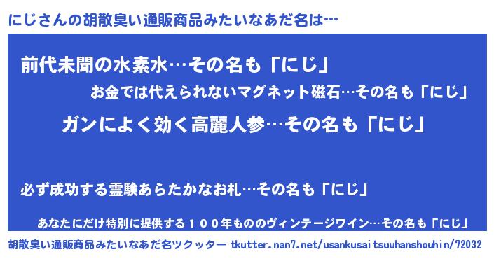 | 男性向けラノベタイトル風あだ名 | 『魔法科高校のにじ』『ニジスレイヤー』 |