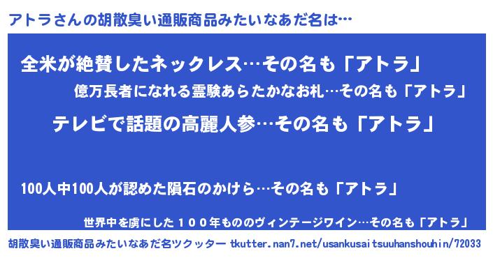 | ヒーロー風カッコイイあだ名 | 『最強戦士アトラ』『天弓騎士アト』 |