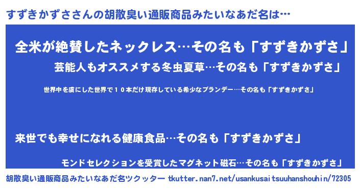 | 男性向けラノベタイトル風あだ名 | 『この素晴らしい世界にすずきかずさを!』 |