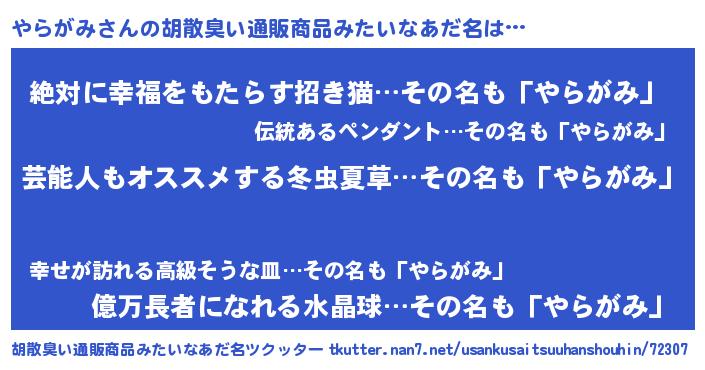 | 意味不明あだ名 | 『自称やらがみ』『永久保存やらがみ』 |