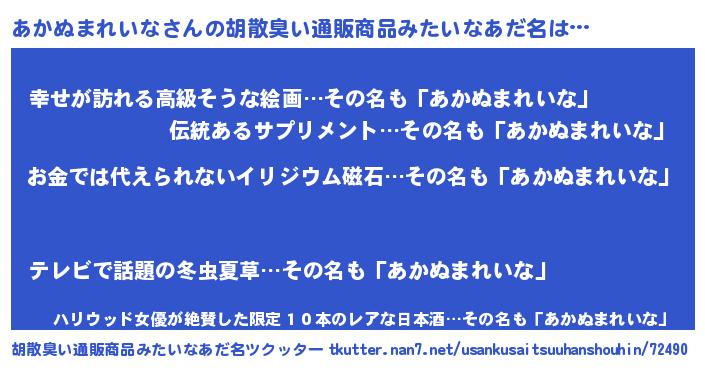 | 男性向けラノベタイトル風あだ名 | 『おまえをオタクにしてやるから、俺をあかぬまれいなにしてくれ! 』 |