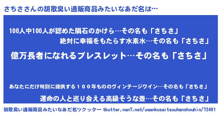 | 男性向けラノベタイトル風あだ名 | 『さちさ~年齢イコール彼女いない歴の魔法使い~』 |