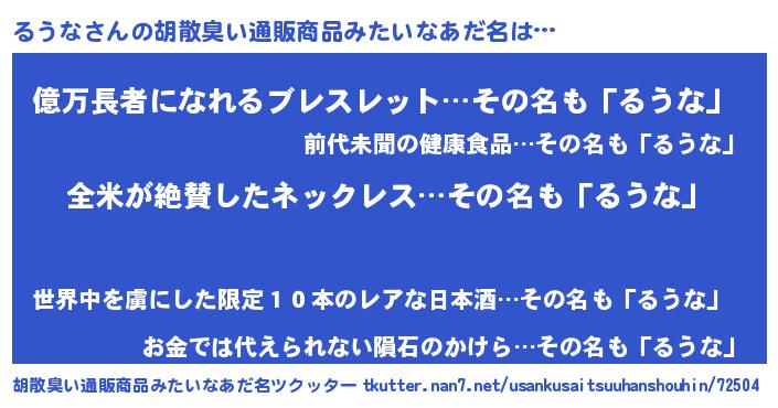 | 男性向けラノベタイトル風あだ名 | 『るうなに滅ぼされるだけの簡単なお仕事です』 |