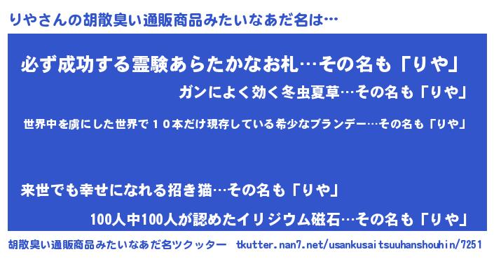 | ヘコむあだ名 | 『りやもー』『りや(苦笑)』『りやを』 |