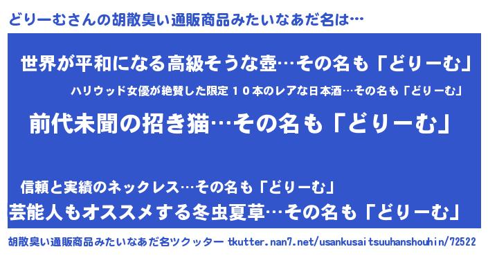 | 男性向けラノベタイトル風あだ名 | 『どりーむに滅ぼされるだけの簡単なお仕事です』 |
