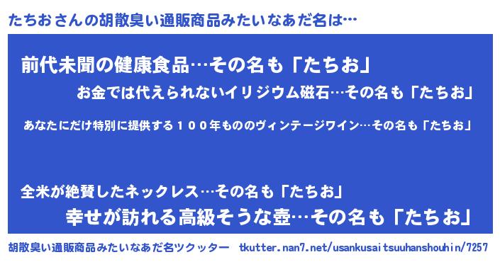 | 意味不明あだ名 | 『住所不定無職たちお(7歳)』 |