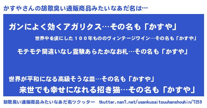| 男性向けラノベタイトル風あだ名 | 『かすやの憂鬱』『緋弾のカスヤ』 |