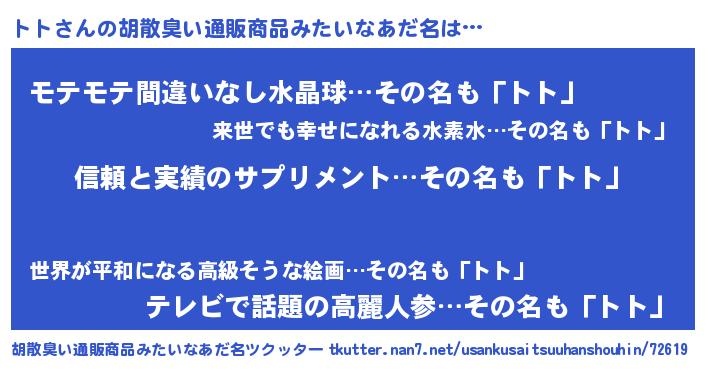 | 女子向けラノベタイトル風あだ名 | 『トトは平凡を望む』『トトアンティーク』 |