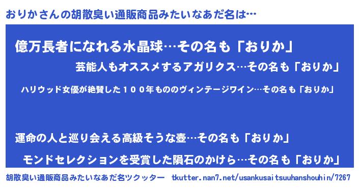 | 意味不明あだ名 | 『住所不定無職おりか(12歳)』『自称おりか』 |