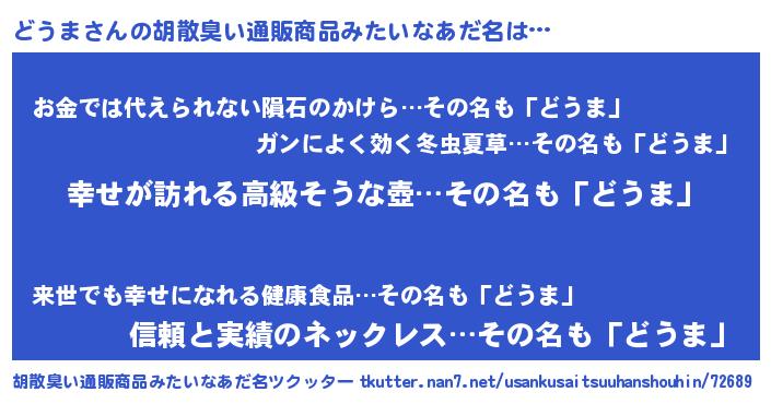 | 男性向けラノベタイトル風あだ名 | 『やはりどうまの青春ラブコメはまちがっている 』 |