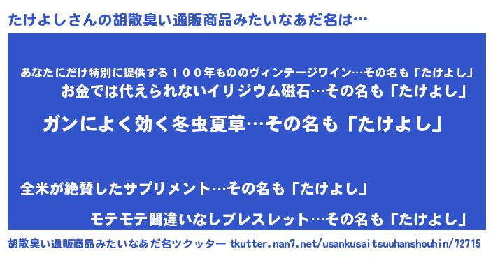 | ヘコむあだ名 | 『たけもー』『たけを』『なまこ酢』 |