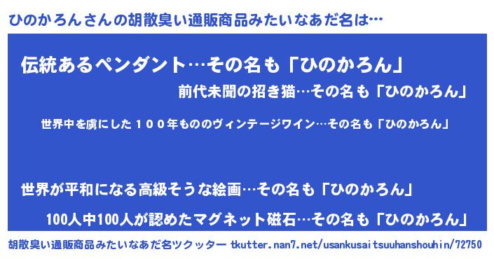| 意味不明あだ名 | 『住所不定無職ひのかろん(10歳)』 |