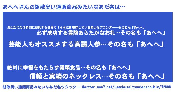 | 意味不明あだ名 | 『自称あへへ』『めかぶ科あへへ属』 |