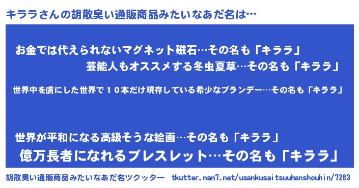 | 男性向けラノベタイトル風あだ名 | 『この素晴らしい世界にキララを!』 |
