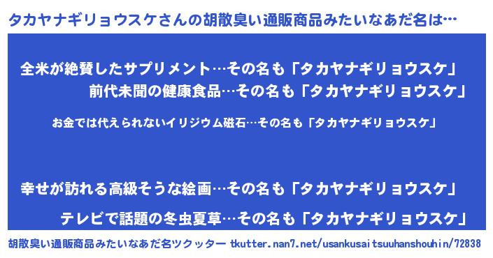 | 男性向けラノベタイトル風あだ名 | 『転生したらタカヤナギリョウスケだった件』 |