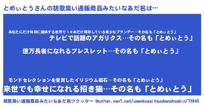 | 意味不明あだ名 | 『ペロリンとめぃとう』『自称とめぃとう』 |
