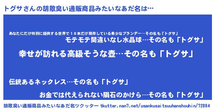 | ヘコむあだ名 | 『つくし』『トグもー』『トグぷりん』 |