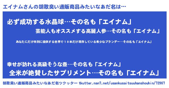 | 男性向けラノベタイトル風あだ名 | 『エイナム~年齢イコール彼女いない歴の魔法使い~』 |