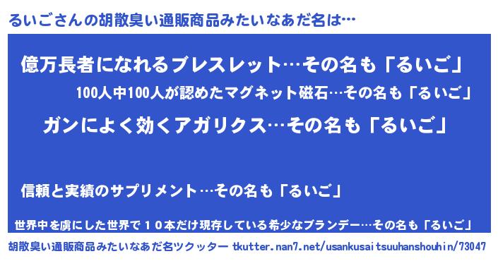| ヘコむあだ名 | 『るいにゅー』『るいを』『なまこ酢』 |
