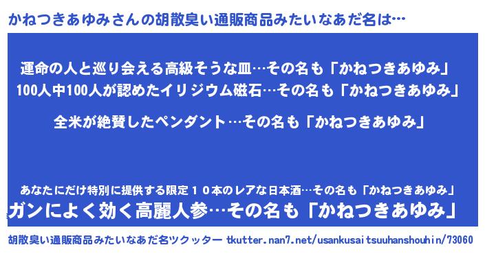 | 男性向けラノベタイトル風あだ名 | 『かねつきあゆみの嫁は女の子じゃないと思った?』 |