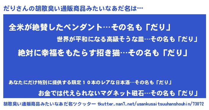 | 男性向けラノベタイトル風あだ名 | 『だりという概念が存在しない退屈な世界 』 |