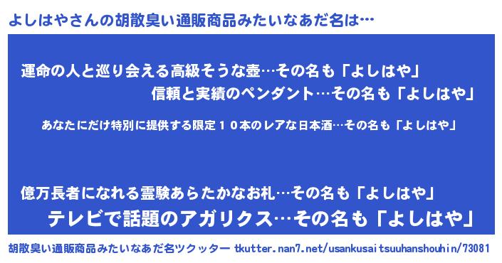 | 意味不明あだ名 | 『住所不定無職よしはや(47歳)』 |