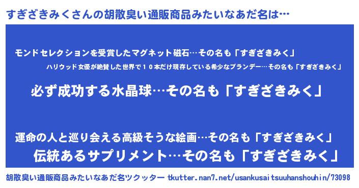 | ヒーロー風カッコイイあだ名 | 『スーパースギザキミク』『銀牙騎士スギ』 |