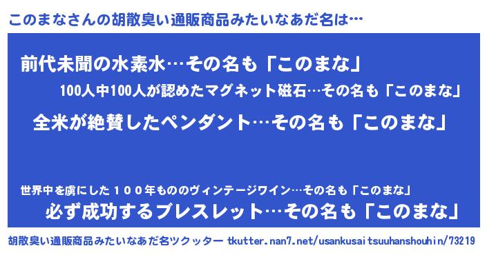 | 男性向けラノベタイトル風あだ名 | 『このまなに滅ぼされるだけの簡単なお仕事です』 |