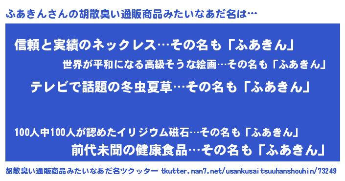 | 意味不明あだ名 | 『自称ふあきん』『永久保存ふあきん』 |