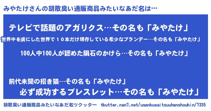 | ヘコむあだ名 | 『みやっふぃ~』『みやたけ(笑)』 |