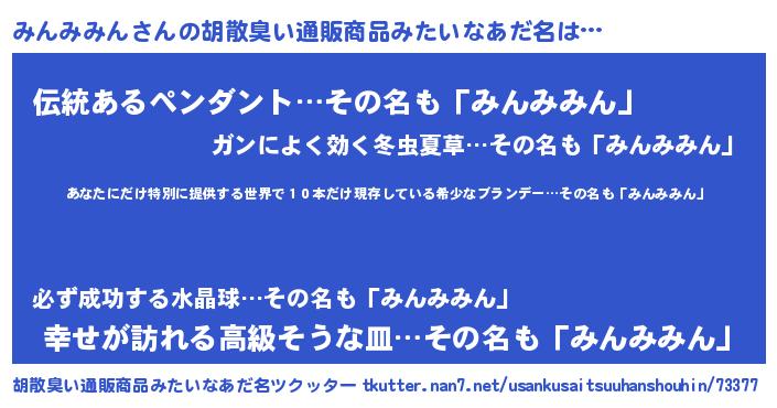 | 意味不明あだ名 | 『住所不定無職みんみみん(77歳)』 |