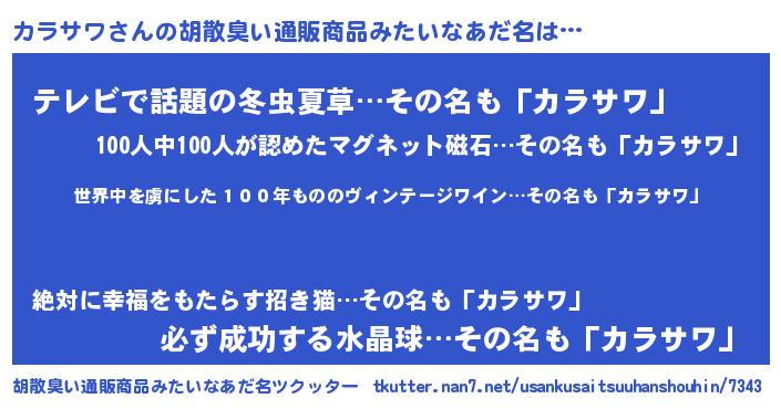 | 男性向けラノベタイトル風あだ名 | 『カラサワに滅ぼされるだけの簡単なお仕事です』 |