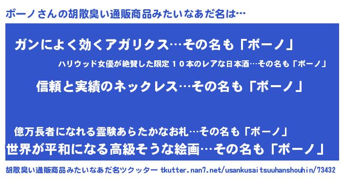 | 男性向けラノベタイトル風あだ名 | 『ボーノスレイヤー』『緋弾のボーノ』 |