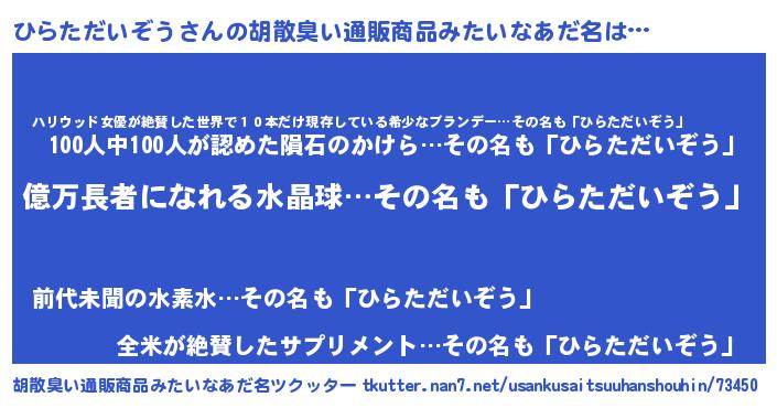| 男性向けラノベタイトル風あだ名 | 『ひらただいぞう~年齢イコール彼女いない歴の魔法使い~』 |