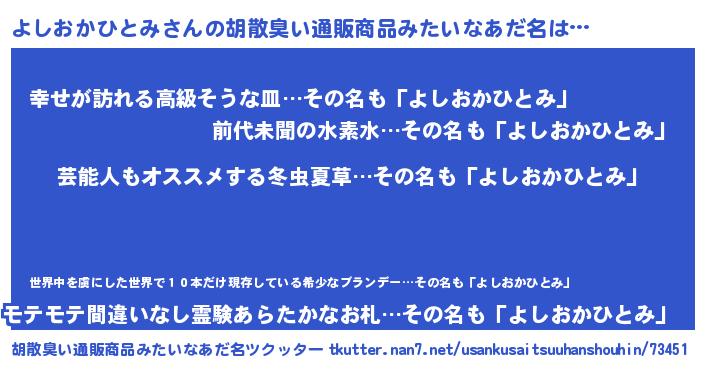 | 男性向けラノベタイトル風あだ名 | 『Re:よしおかひとみから始める異世界生活』 |