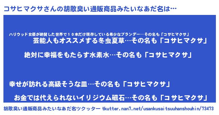 | 男性向けラノベタイトル風あだ名 | 『コサヒマクサスレイヤー』 |