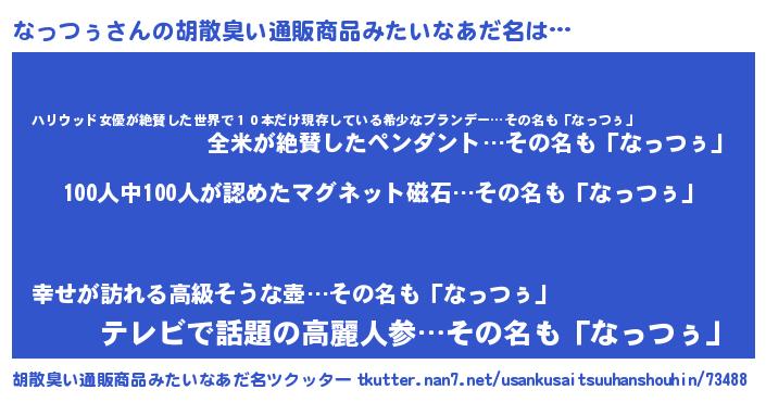 | 男性向けラノベタイトル風あだ名 | 『おまえをオタクにしてやるから、俺をなっつぅにしてくれ! 』 |