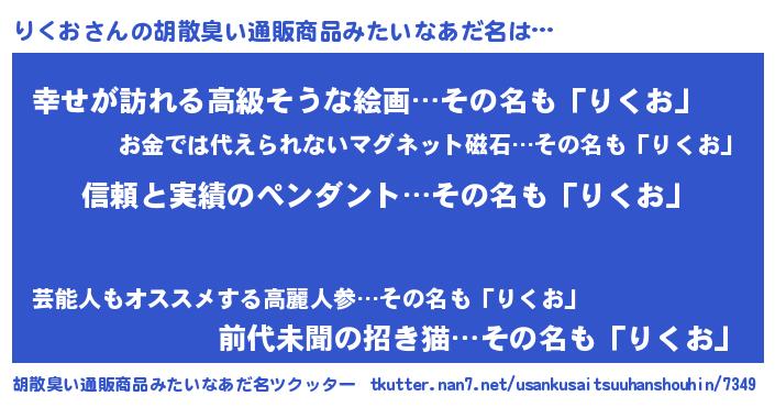 | 男性向けラノベタイトル風あだ名 | 『ダンジョンにりくおを求めるのは間違っているだろうか』 |