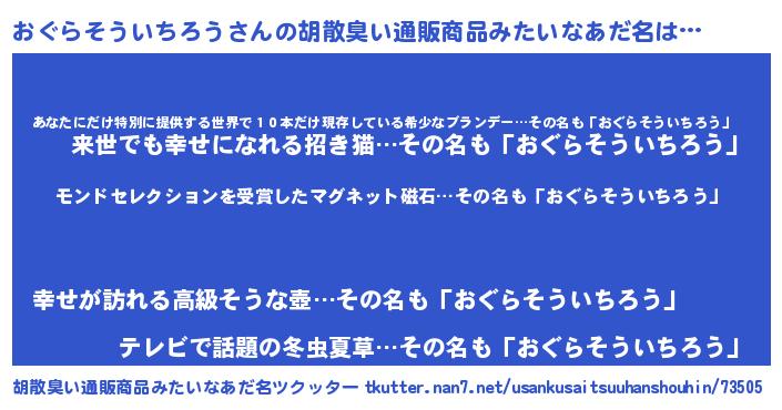| 男性向けラノベタイトル風あだ名 | 『おぐらそういちろうに滅ぼされるだけの簡単なお仕事です』 |