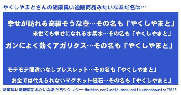 | 男性向けラノベタイトル風あだ名 | 『ヤクシヤマトスレイヤー』 |