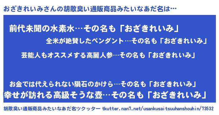 | 男性向けラノベタイトル風あだ名 | 『おざきれいみ~年齢イコール彼女いない歴の魔法使い~』 |