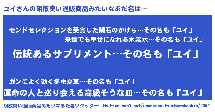 | 意味不明あだ名 | 『とにかく怪しいユイ』『永久保存ユイ』 |