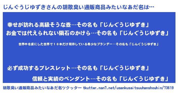 | 意味不明あだ名 | 『住所不定無職じんぐうじゆずき(74歳)』 |