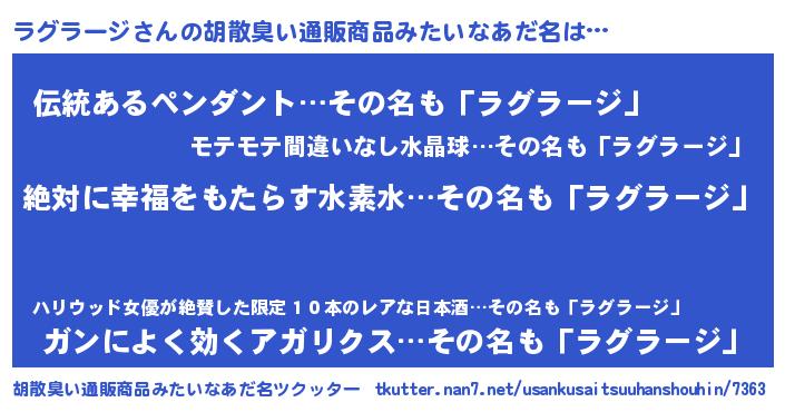 | 男性向けラノベタイトル風あだ名 | 『ラグラージという概念が存在しない退屈な世界 』 |