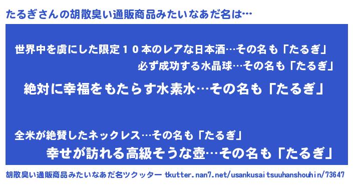 | 男性向けラノベタイトル風あだ名 | 『たるぎという概念が存在しない退屈な世界 』 |