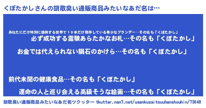 | 男性向けラノベタイトル風あだ名 | 『おまえをオタクにしてやるから、俺をくぼたかしにしてくれ! 』 |