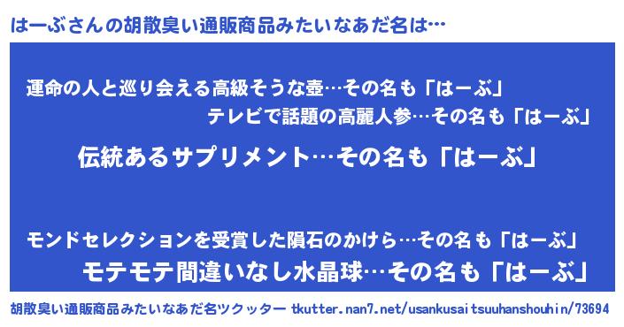 | 意味不明あだ名 | 『とにかく怪しいはーぶ』『自称はーぶ』 |