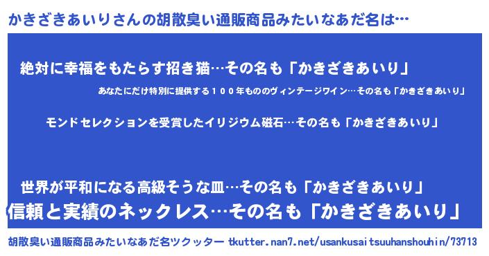 | 男性向けラノベタイトル風あだ名 | 『うちのかきざきあいりが世界を掌握している!』 |